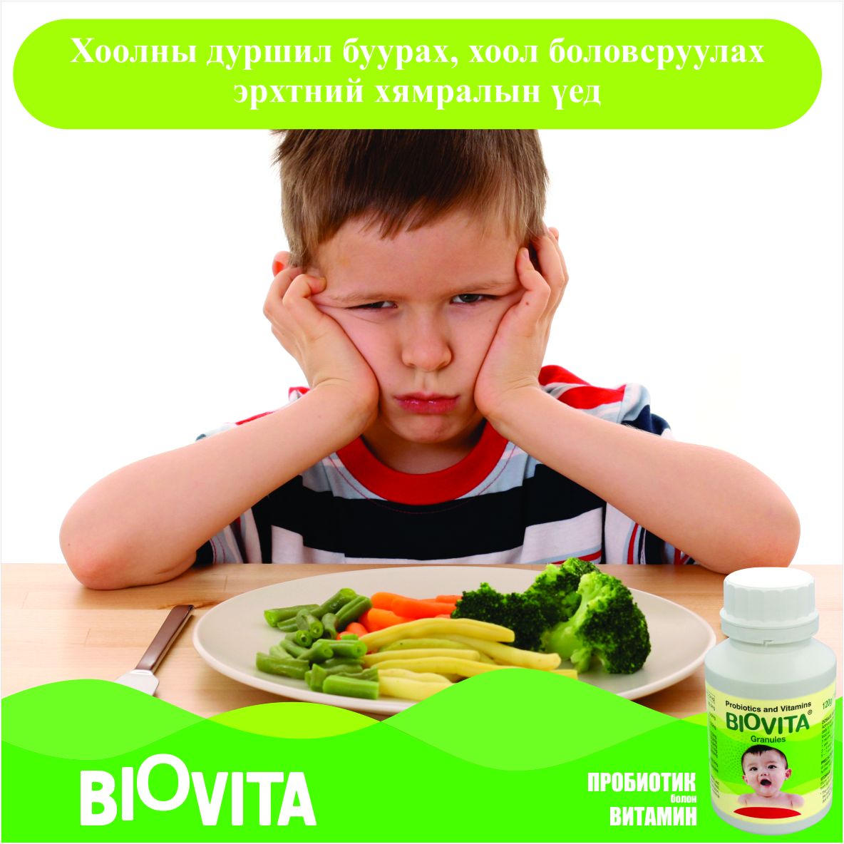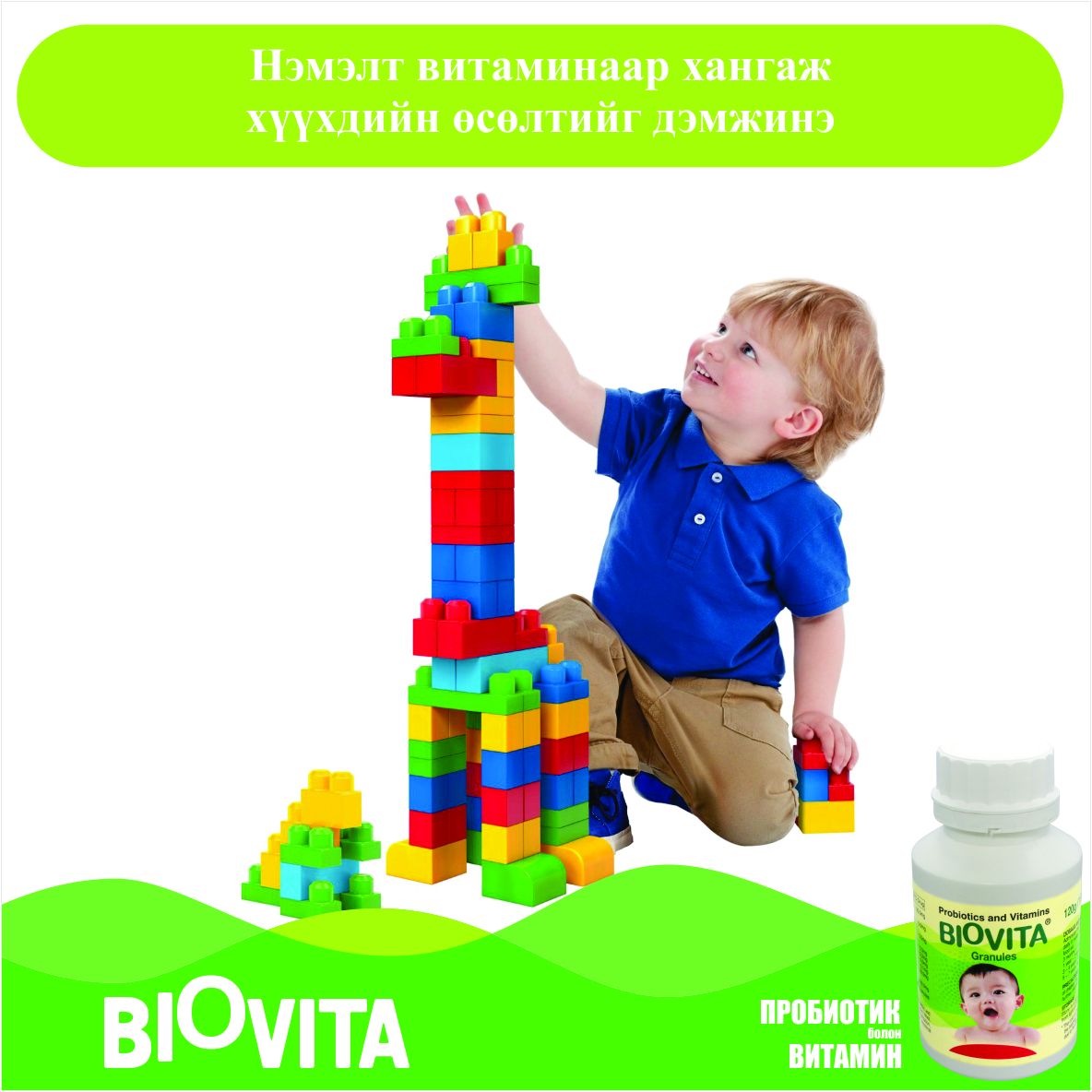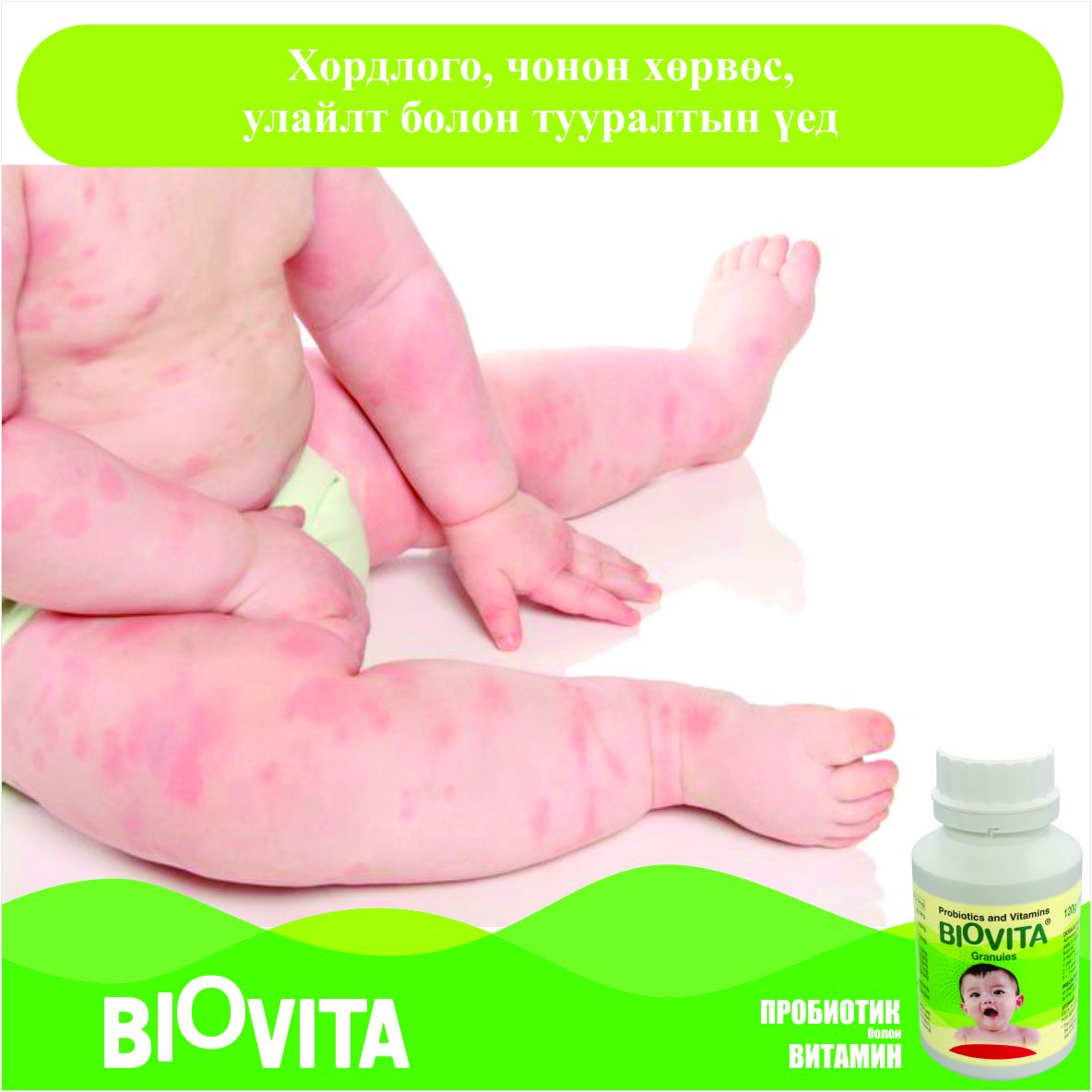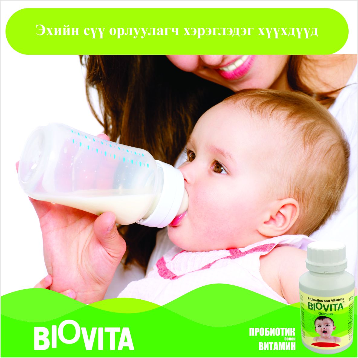 Эрүүл хүүхдийн 1-2 сарын хэрэглээгээр савлагдсан, үргэлжлүүлэн уухад хоргүй зөөлөн, өндөр үр дүнтэй пробиотик болон витамины хослол.
